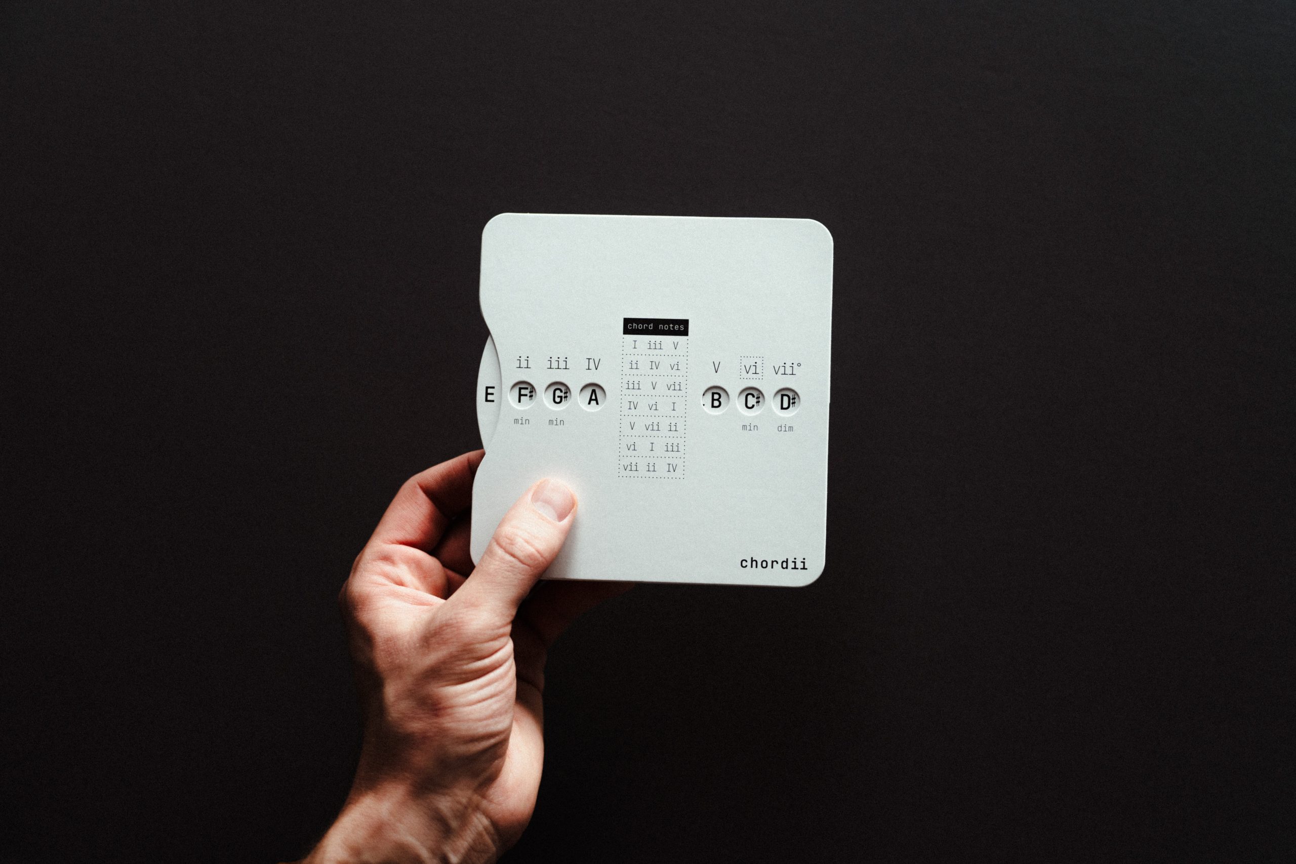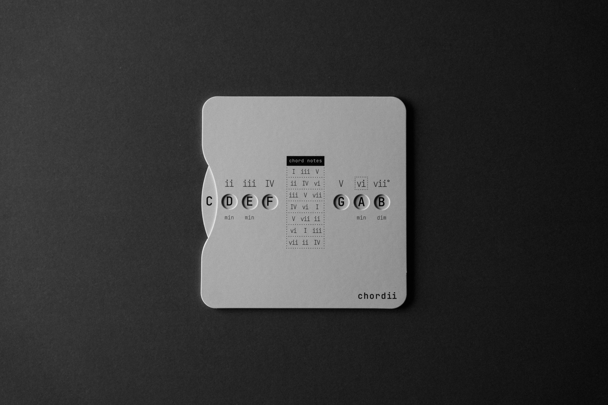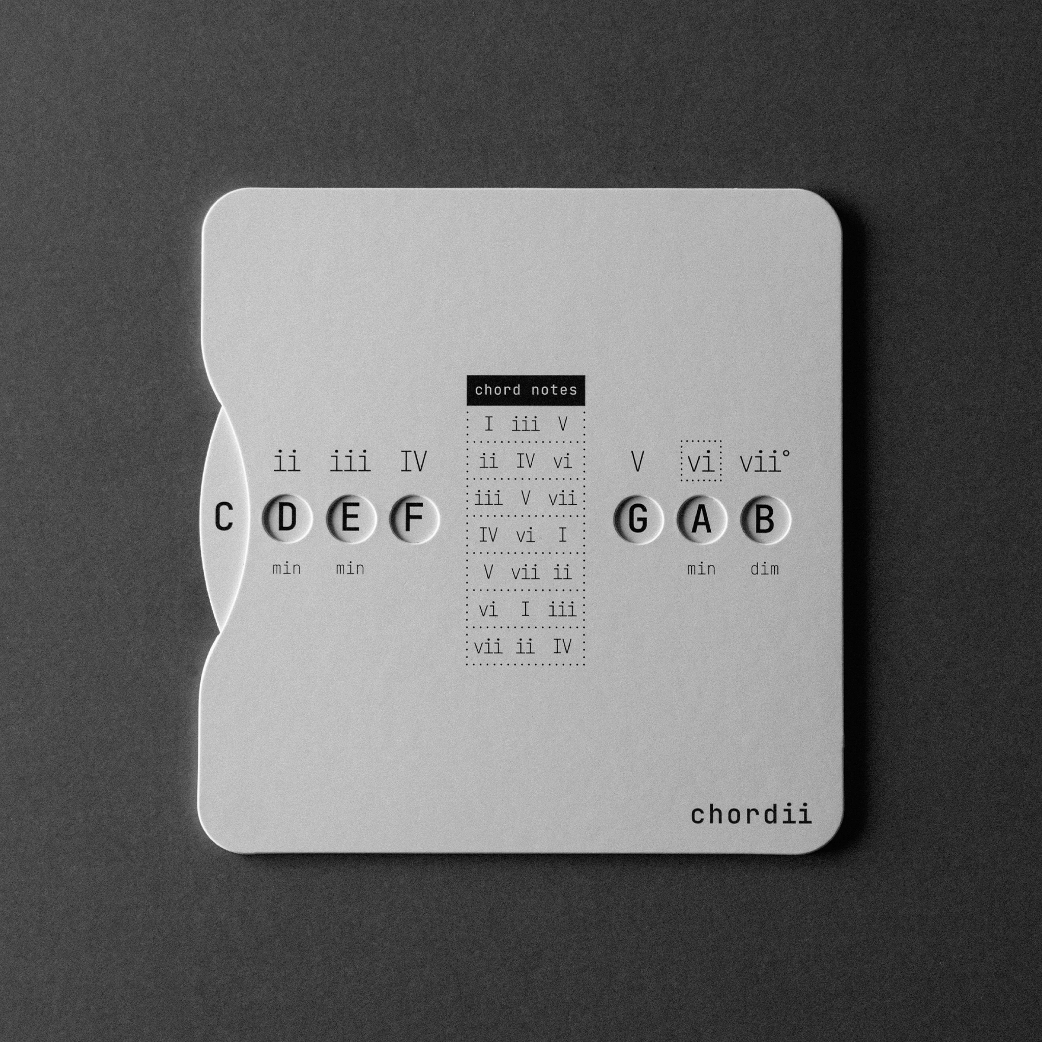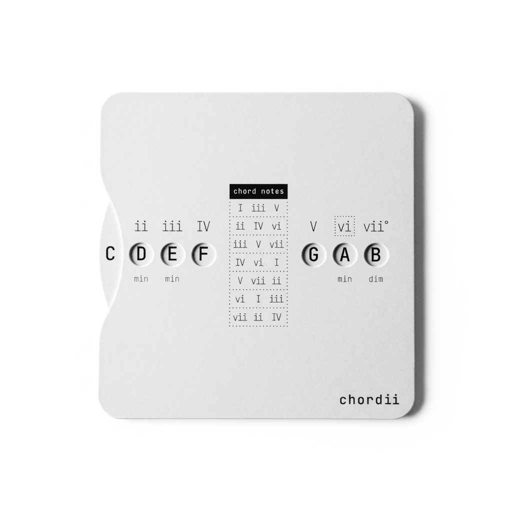 Chordii is an original music theory wheel for musicians who think in Roman numerals. The front maps every diatonic chord in any key – I through vii° -with tactile sliding buttons. The back is a chord progression reference: 15 progressions, each tagged with an emotional mood. Flip between keys. Find your sound.