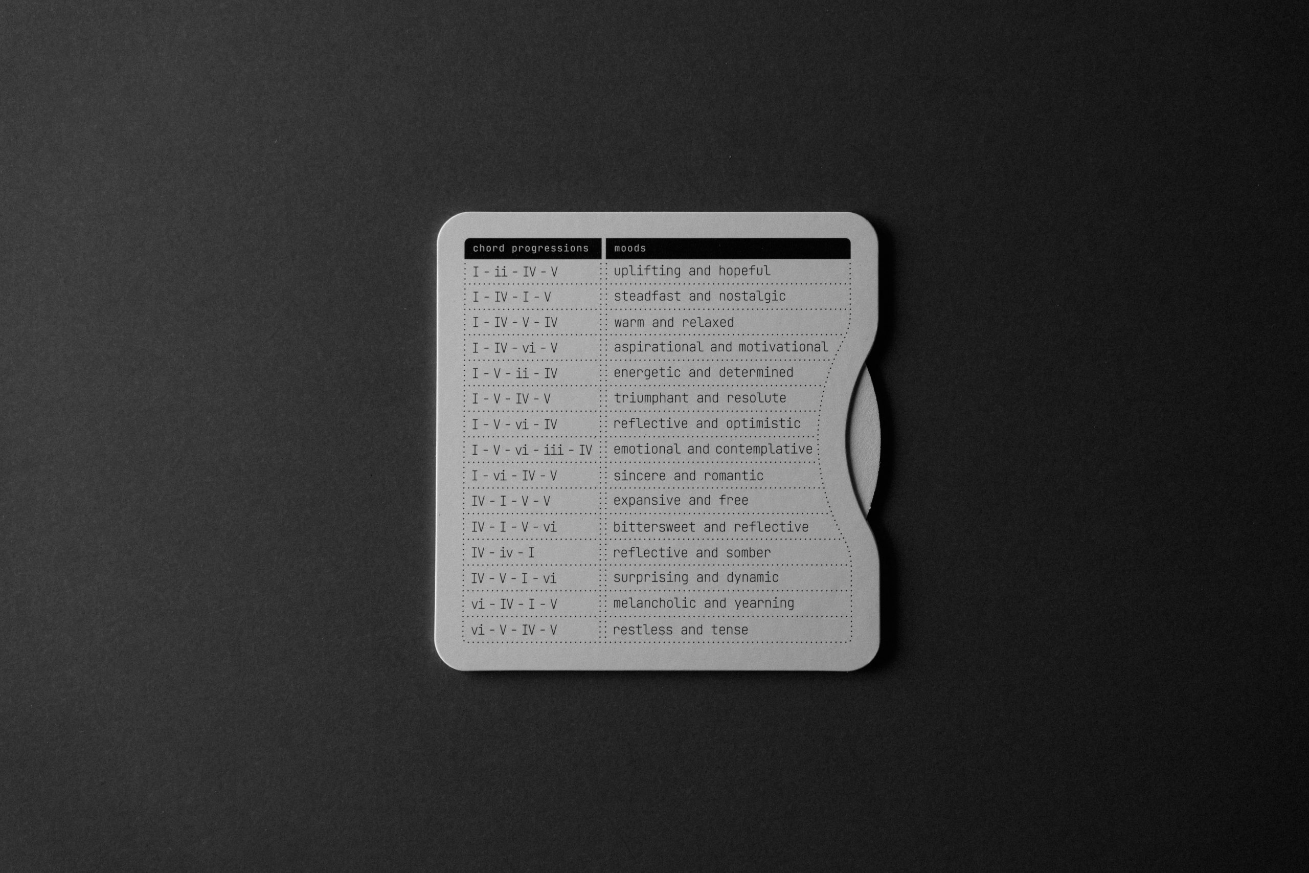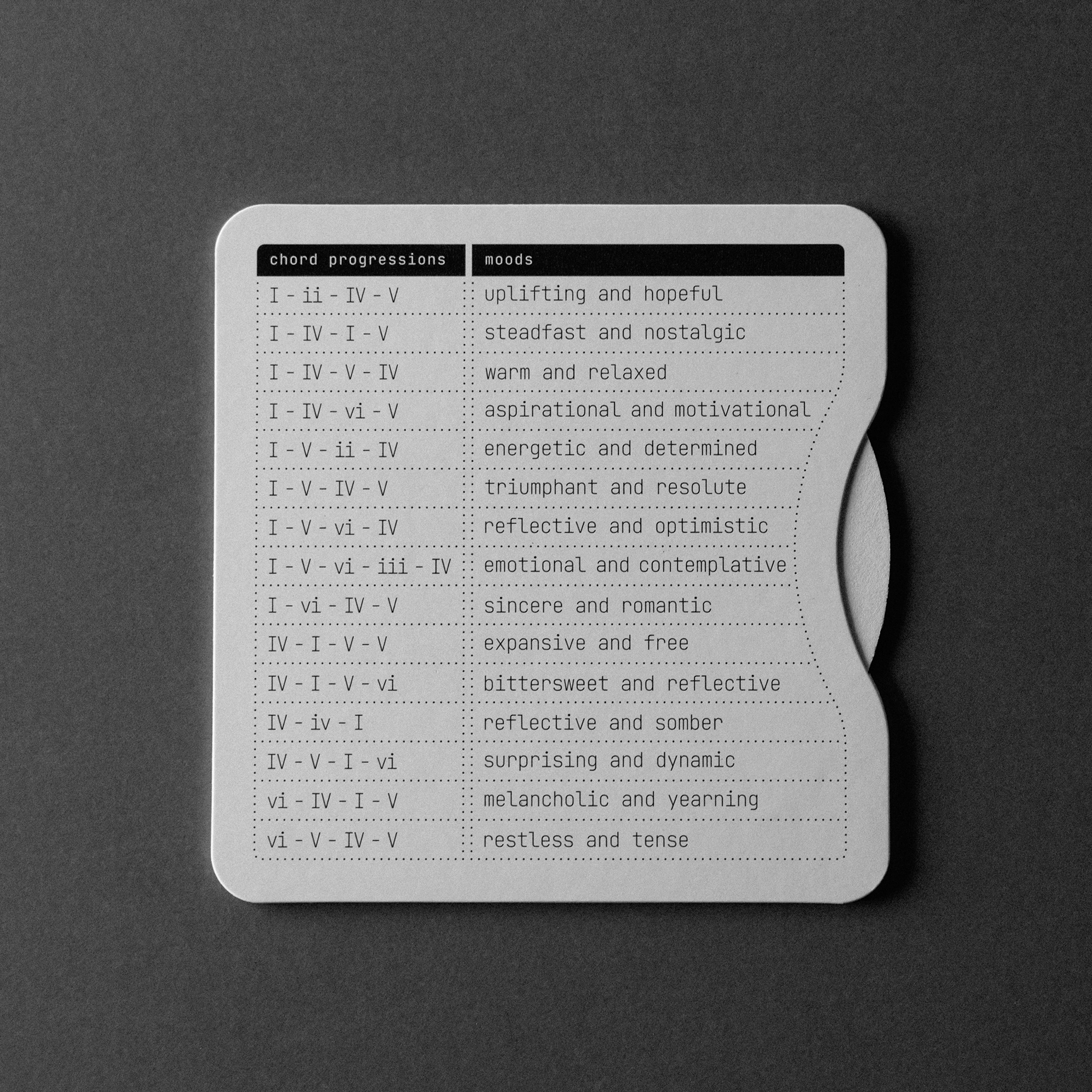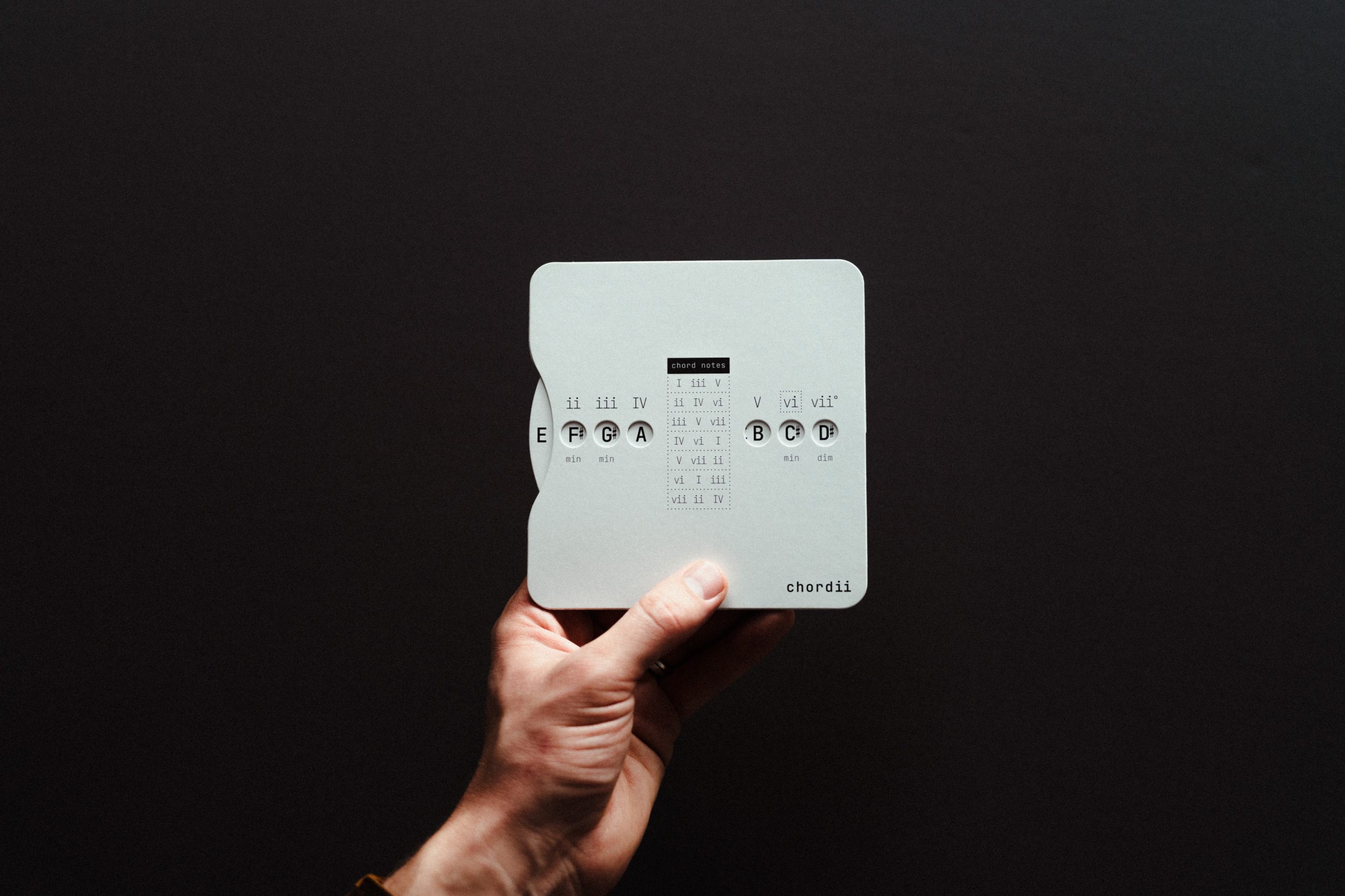 Chordii is an original music theory wheel for musicians who think in Roman numerals. The front maps every diatonic chord in any key – I through vii° -with tactile sliding buttons. The back is a chord progression reference: 15 progressions, each tagged with an emotional mood. Flip between keys. Find your sound.