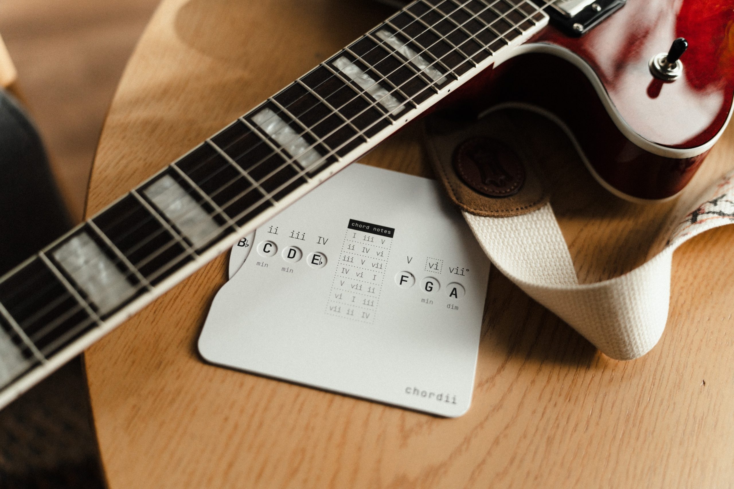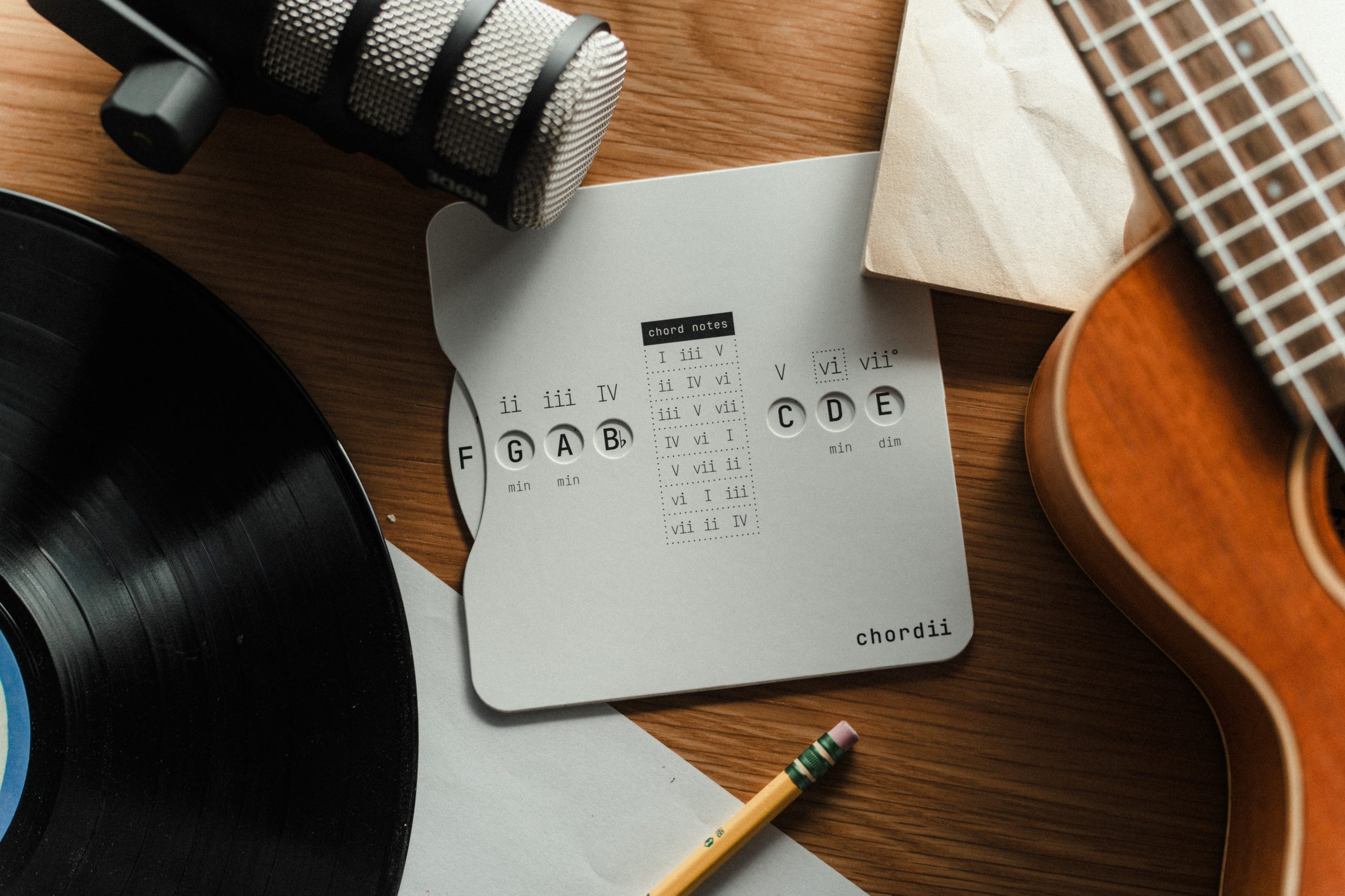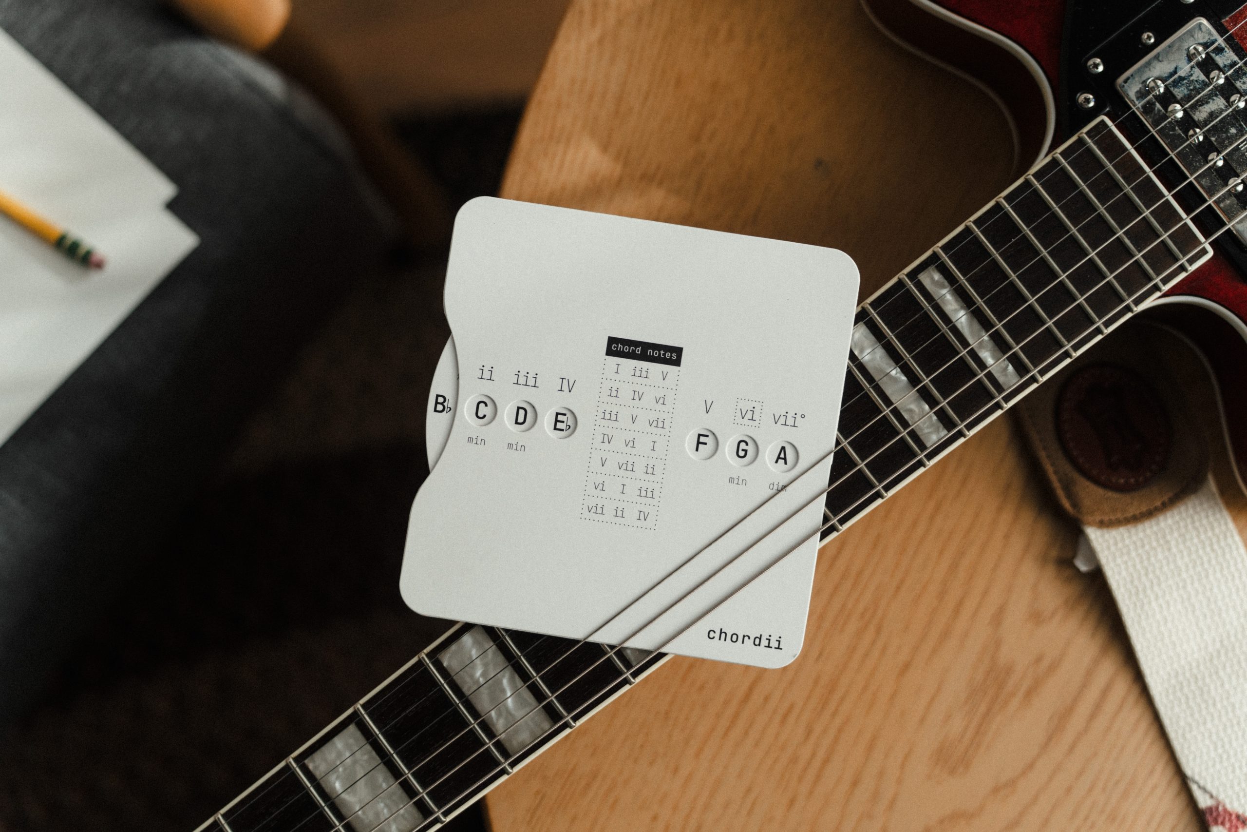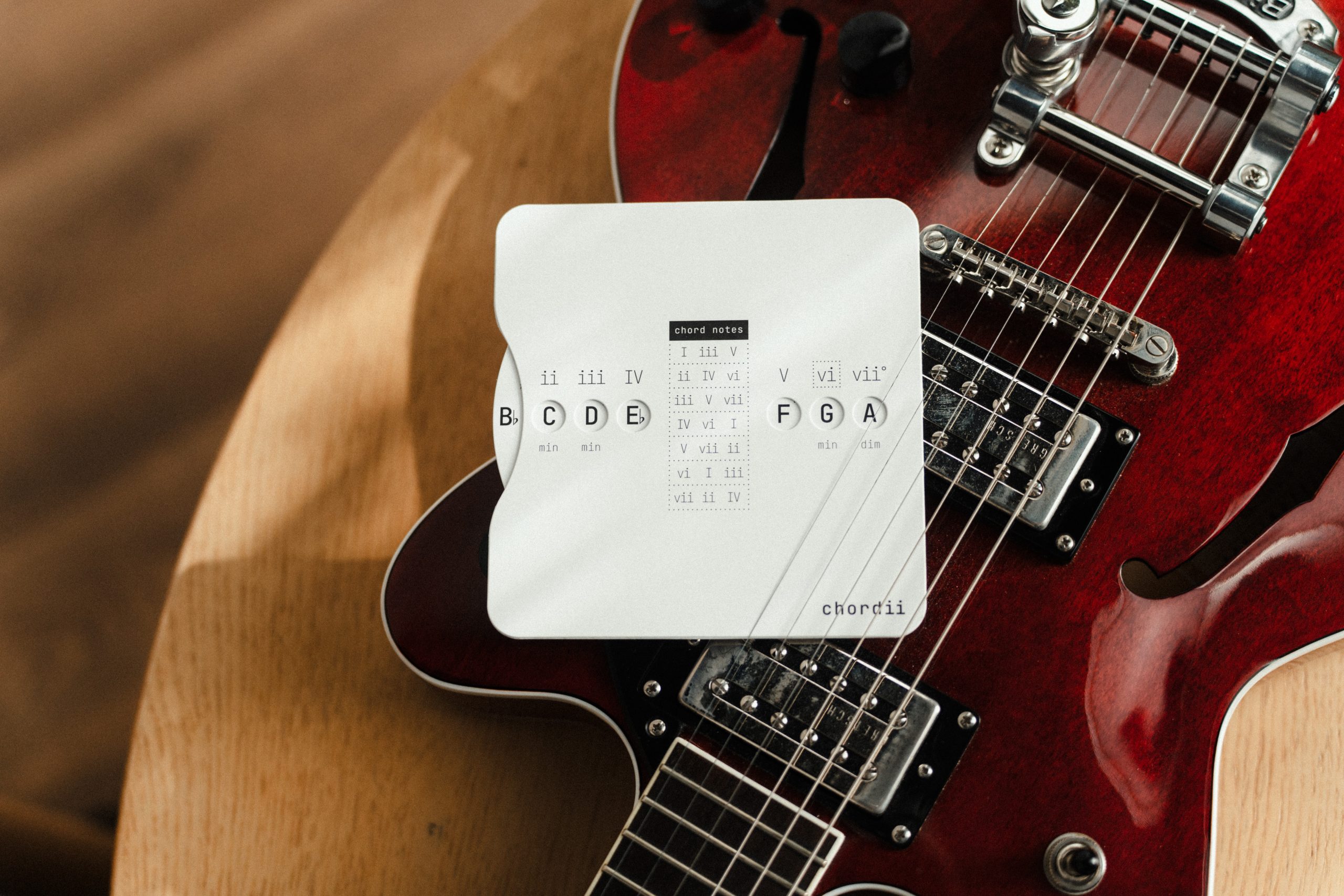 Chordii is an original music theory wheel for musicians who think in Roman numerals. The front maps every diatonic chord in any key – I through vii° -with tactile sliding buttons. The back is a chord progression reference: 15 progressions, each tagged with an emotional mood. Flip between keys. Find your sound.