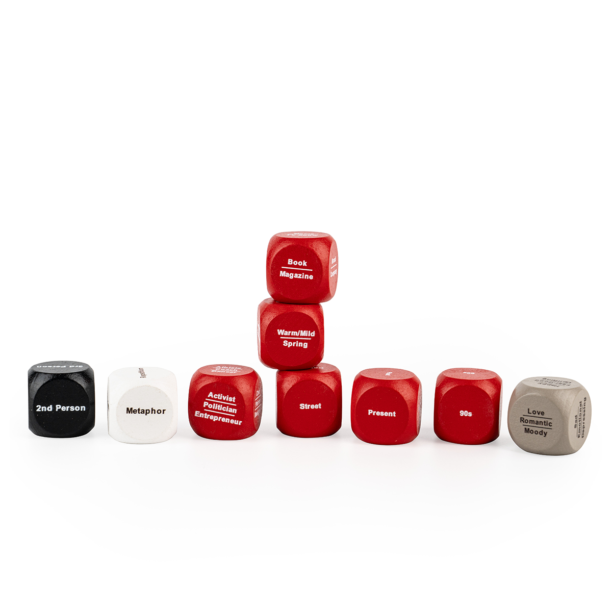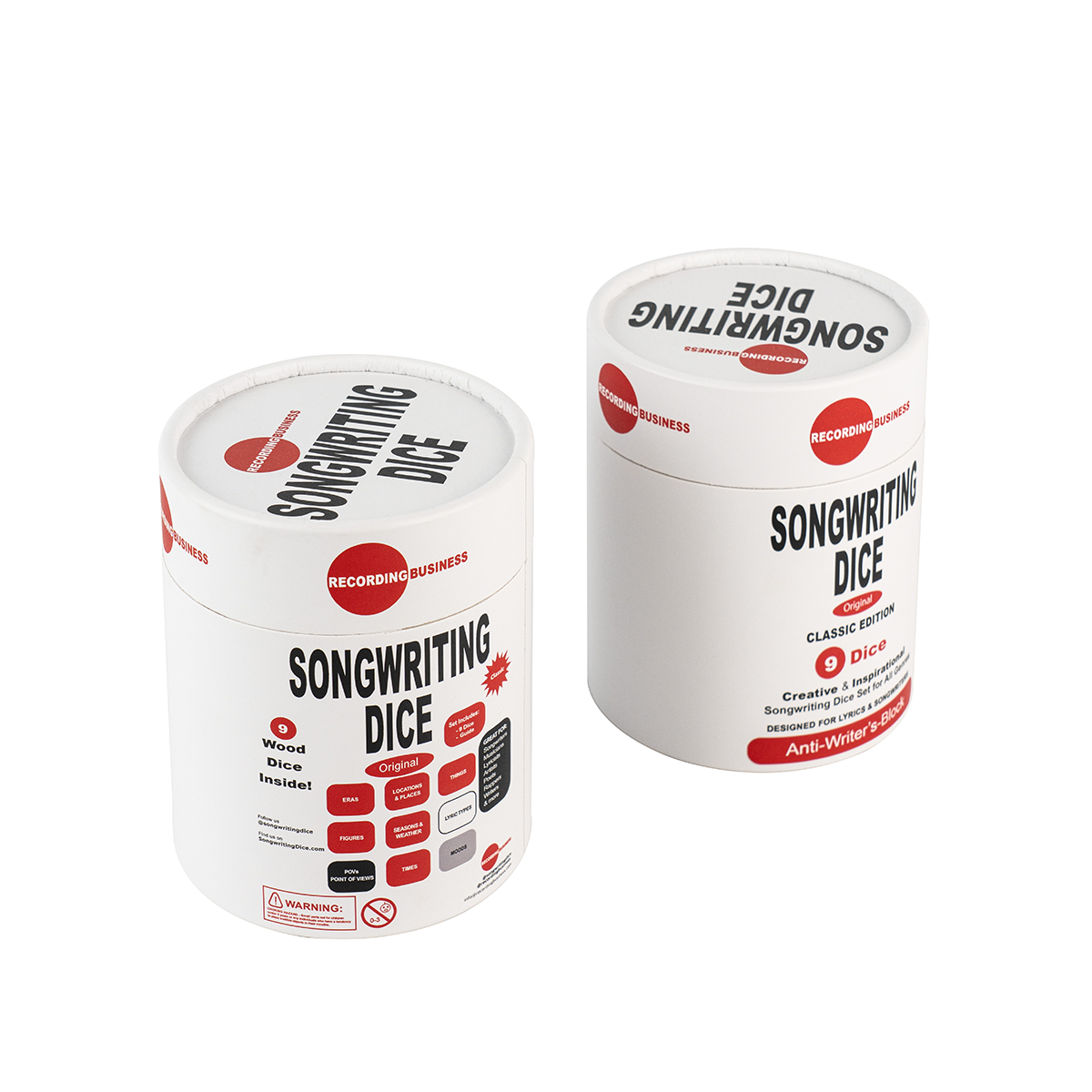 Songwriting Dice: 9 Songwriting Dice Set for Musicians of all Genres by Recording Business. Classic Edition. Original 9 color-coded wood dice set (with easy to read text that include Eras, Things, Figures, POV (Point of Views), Times, Locations & Places, Lyric Types, & Seasons & Weather). Just Roll the dices! A full guide is inside.